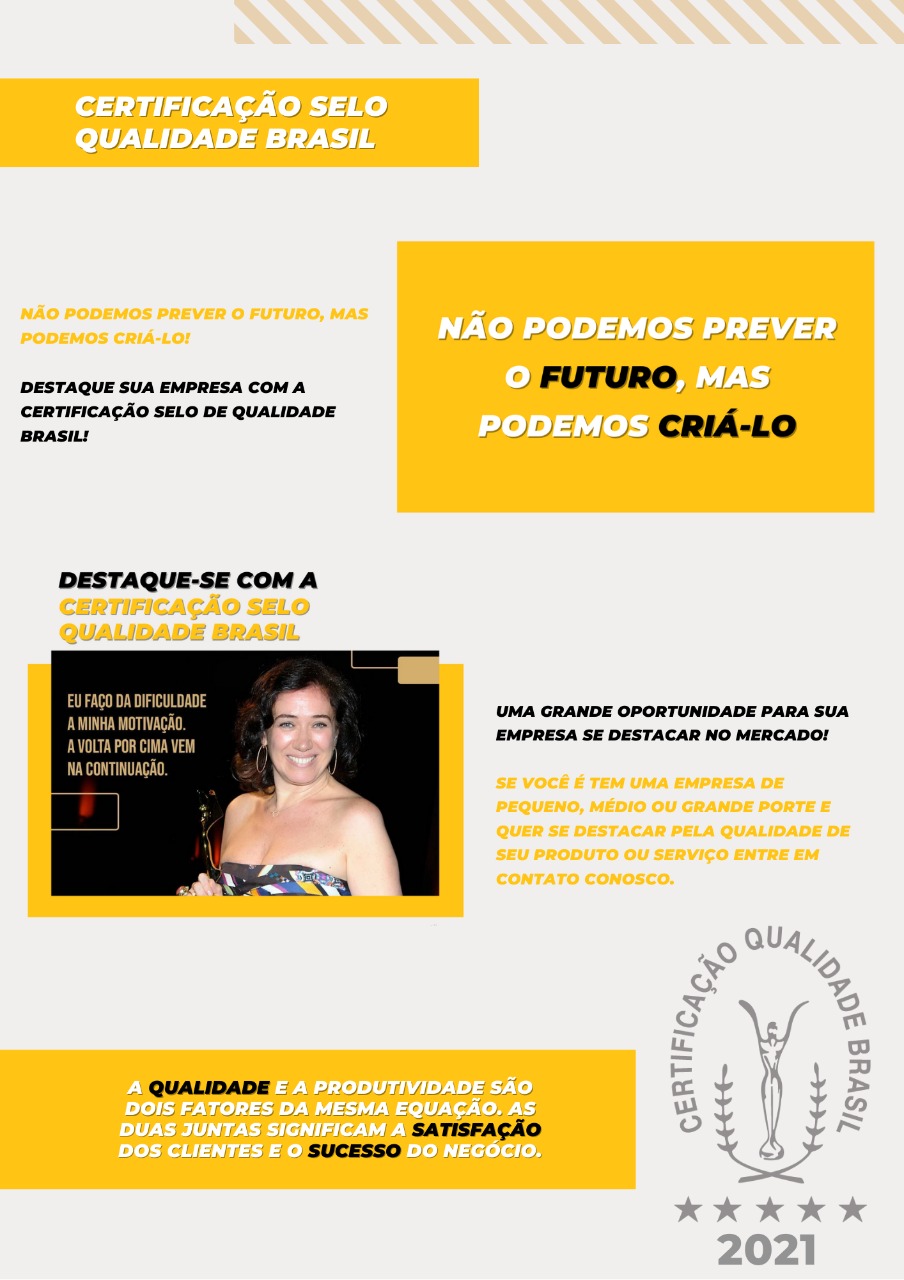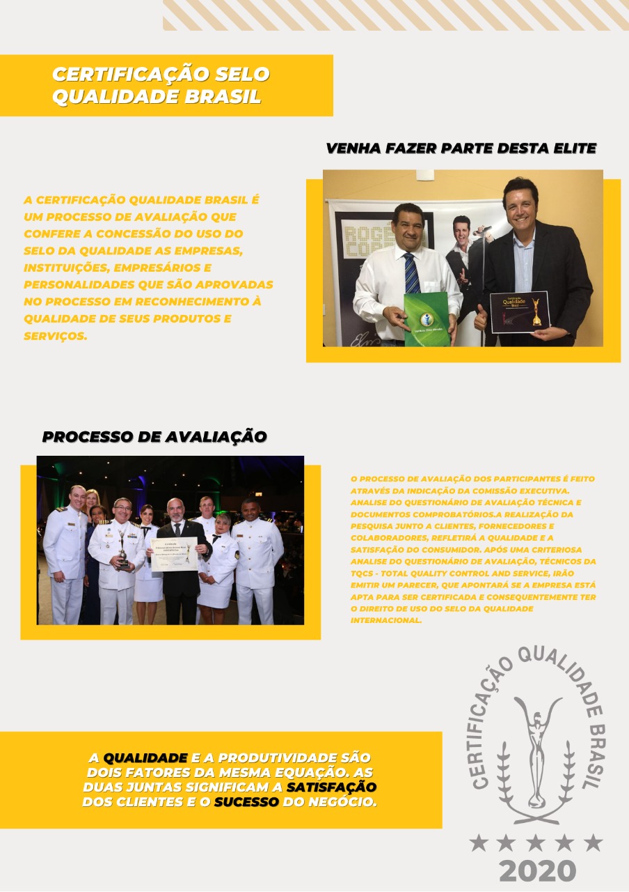 A Certificação Qualidade Brasil é um processo de avaliação que confere a concessão do Uso do Selo da Qualidade as empresas, empresários e personalidades que são aprovadas no processo em reconhecimento à qualidade de seus produtos e serviços. Somente a Instituição que foi aprovada nos requisitos exigidos do processo de avaliação recebe a Certificação Prêmio Qualidade Brasil.
